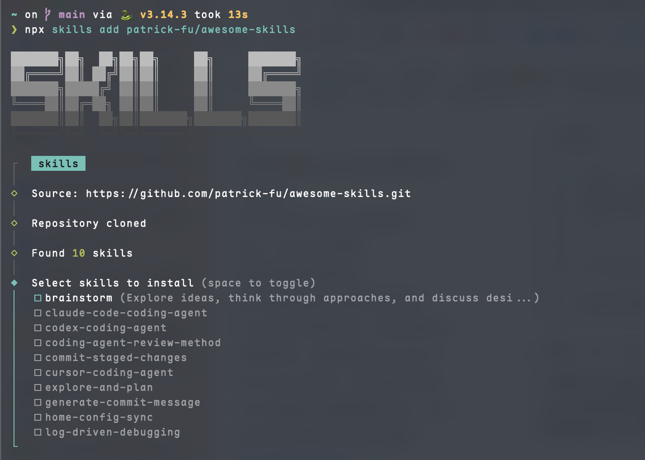npx skills add patrick-fu/awesome-skills一键更新: